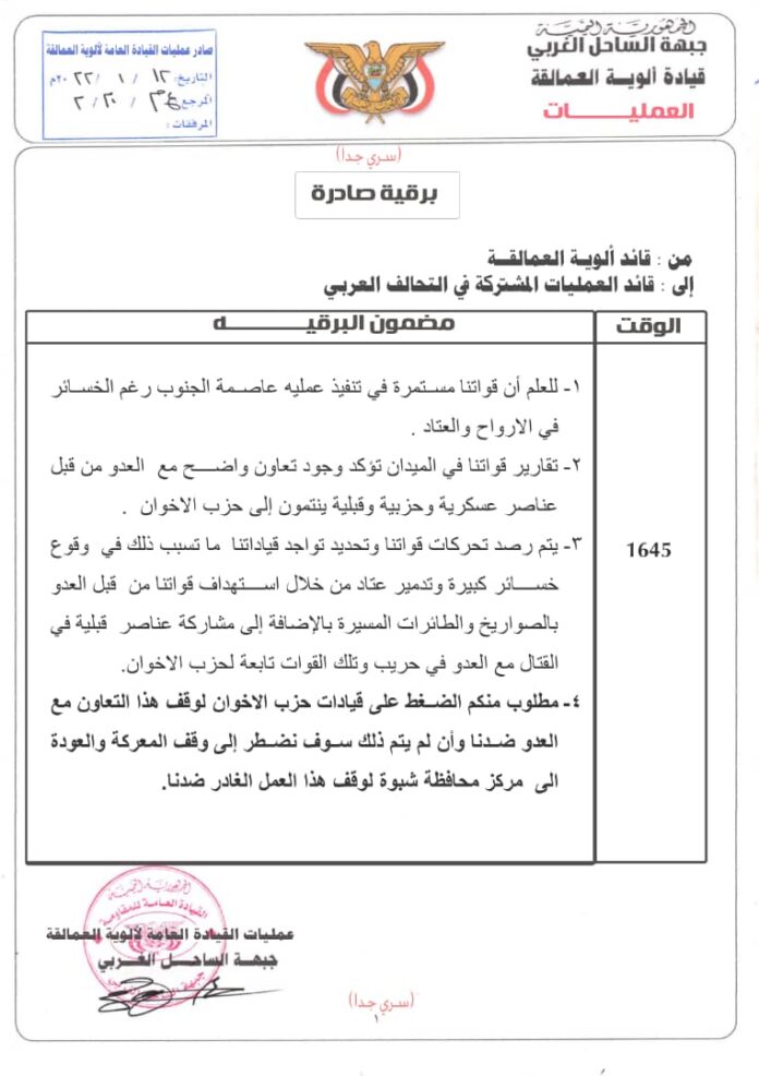 ae العمالقة تتهم الإصلاح بـ”الخيانة” وتهدد بالإنسحاب من الجبهات By - January 15, 2022 0 172 FacebookTwitterPinterestWhatsApp …المحافظة النفطية، مبينة أن تلك الخيانة أسفرت عن مقتل العشرات من قيادات الفصائل الإماراتية. وأشارت إلى أن قوات هادي والإصلاح تقوم برصد تحركات ألوية العمالقة وإرسالها لقوات صنعاء، فضلا عن مشاركة عدد من القبائل القتال في صفوف الأخيرة. وطالب قائد…