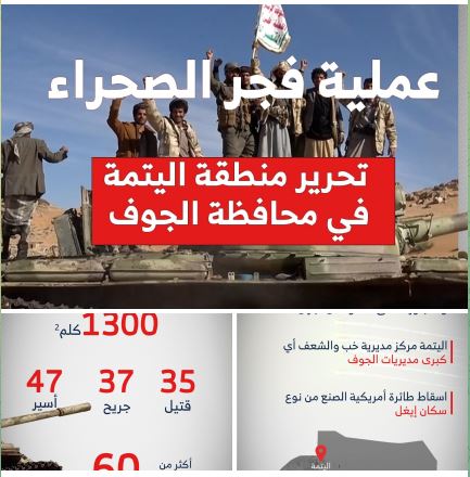 ae عملية ‘فجر الصحراء’ العسكرية .. تحرير ‘اليَتَمَة’ الاستراتيجية ضربة موجعة لتحالف العدوان على… By - December 31, 2021 0 254 FacebookTwitterPinterestWhatsApp …خسارة آخر معركة له في شمال اليمن. يوم الأربعاء شن طيران العدوان الأمريكي السعودي الإماراتي، 26 غارة جوية على مناطق متفرقة من محافظات مأرب والجوف وتعز وشبوة والبيضاء، 7 منها على البلق بمديرية الوادي وغارتين على مديرية صرواح وغارة على حريب في مأرب…