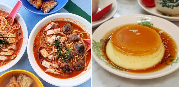 Chee cheong fan, popiah, prawn mee, satay, hor fun, and caramel custard