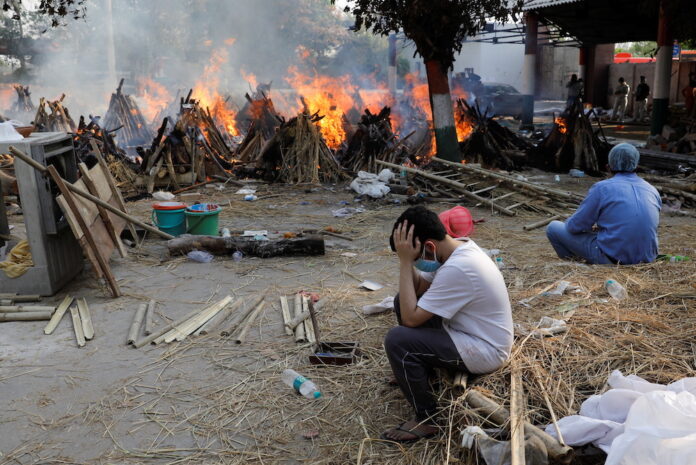 Family members sit next to the burning funeral pyres of those who died from the coronavirus disease (Covid-19), at a crematorium in New Delhi, India April 26, 2021. — Reuters pic