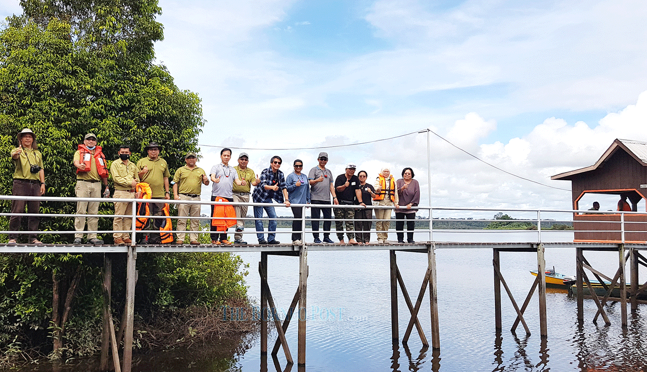 Abdul Karim (fifth right), Dennis (seventh right) and others in a photo call during their visit to Loagan Bunut National Park.