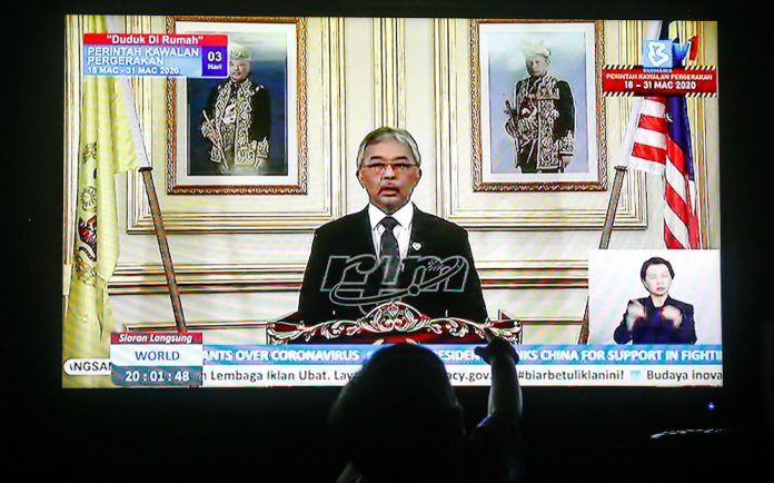 People watch a live telecast of Yang di-Pertuan Agong Al-Sultan Abdullah Ri’ayatuddin Al-Mustafa Billah Shah regarding the movement control order due to the Covid-19 pandemic in Kuala Lumpur March 20, 2020. — Picture by Sayuti Zainudin