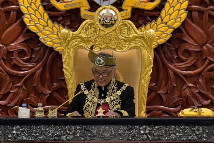 Yang di-Pertuan Agong Al-Sultan Abdullah Ri’ayatuddin Al-Mustafa Billah Shah delivers the royal address when gracing the opening of the First Meeting of the Fifth Session of the 14th Parliament in Kuala Lumpur February 28, 2022. — Bernama pic