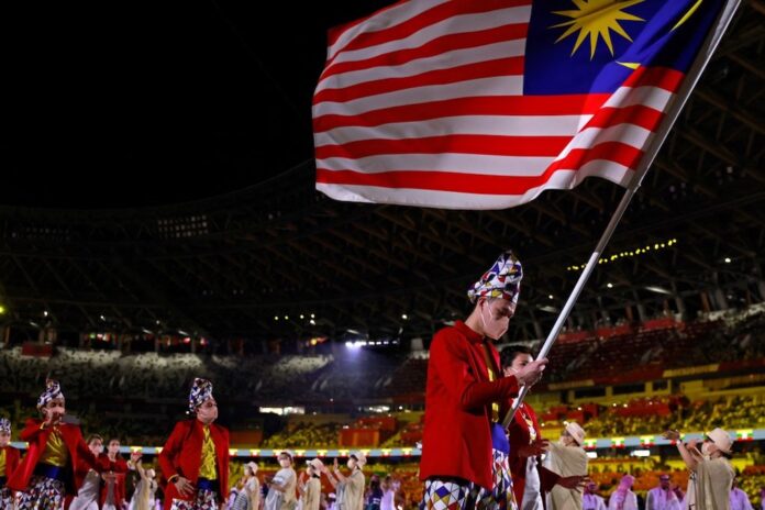 Flag bearer Lee Zii Jia leads Malaysian athletes as they parade during the opening ceremony of the Tokyo 2020 Olympic Games in Tokyo July 23, 2021. — AFP pic