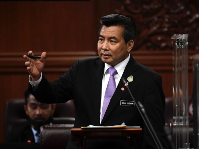 Deputy Defence Minister Datuk Seri Ikmal Hisham Abdul Aziz addresses members of the Senate in Dewan Negara, Kuala Lumpur December 22, 2021. — Bernama pic