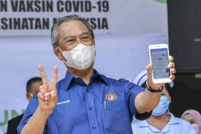 Prime Minister Tan Sri Muhyiddin Yassin looked cheerful while showing the Covid-19 vaccination status displayed on MySejahtera application after receiving the Pfizer-BioNTech Covid-19 vaccine injection at the District Health Centre in Precinct 11, Putrajaya, Feb 24, 2021. — Bernama pic