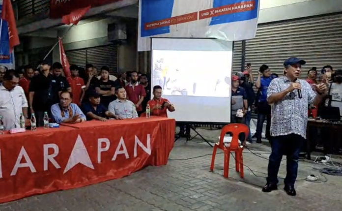 Anifah (right) speaks at a campaign rally at Sulaman Sentral in Kota Kinabalu on Nov 12, 2022. — Picture by Julia Chan