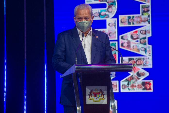 Communications and Multimedia Minister Tan Sri Annuar Musa delivers his speech during the soft launch of Keluarga Malaysia at Auditorium Angkasapuri in Kuala Lumpur, October 8, 2021. — Picture by Shafwan Zaidon