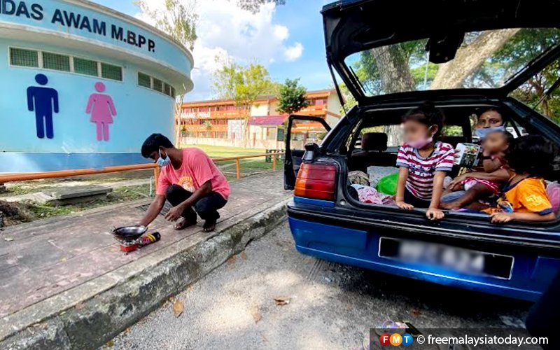 GEORGE TOWN: Berbumbungkan kereta sebagai rumah, lima sekeluarga juga terpaksa menumpang mandi di tandas awam dan mengalas perut dengan roti kosong pemberian orang awam.