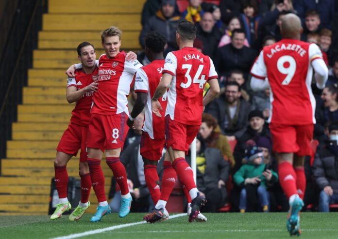 Arsenal’s Martin Odegaard celebrates scoring their first goal against Watford with teammates at Vicarage Road, Watford March 6, 2022. — Reuters pic