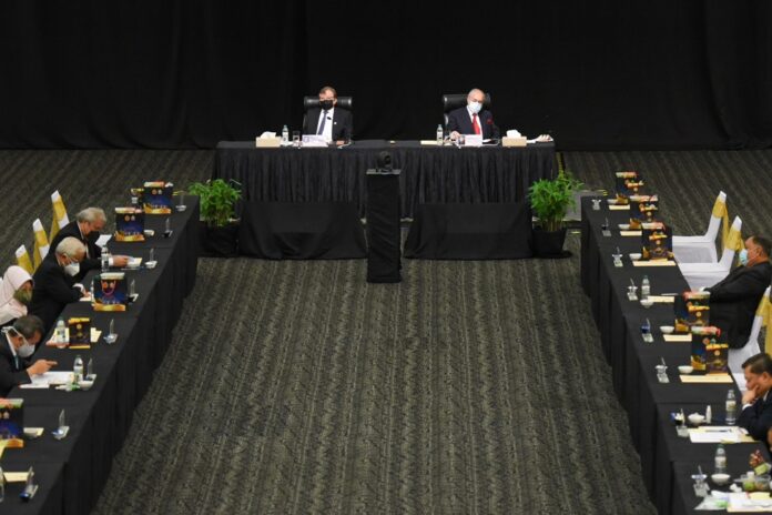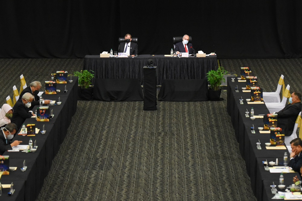 Datuk Patinggi Abang Johari Tun Openg seated on the left at the special budget meeting in Kuching. Seated next to him is Dewan Undangan Negeri Speaker Datuk Amar Mohamad Asfia Awang Nassar. — Borneo Post Online pic