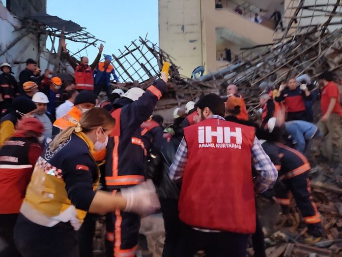This handout picture released by Turkey’s IHH humanitarian aid group on November 9, 2021, shows members of rescue services as they work at the site of a collapsed building in the town of Battalgazi, in Malatya province. — AFP pic
