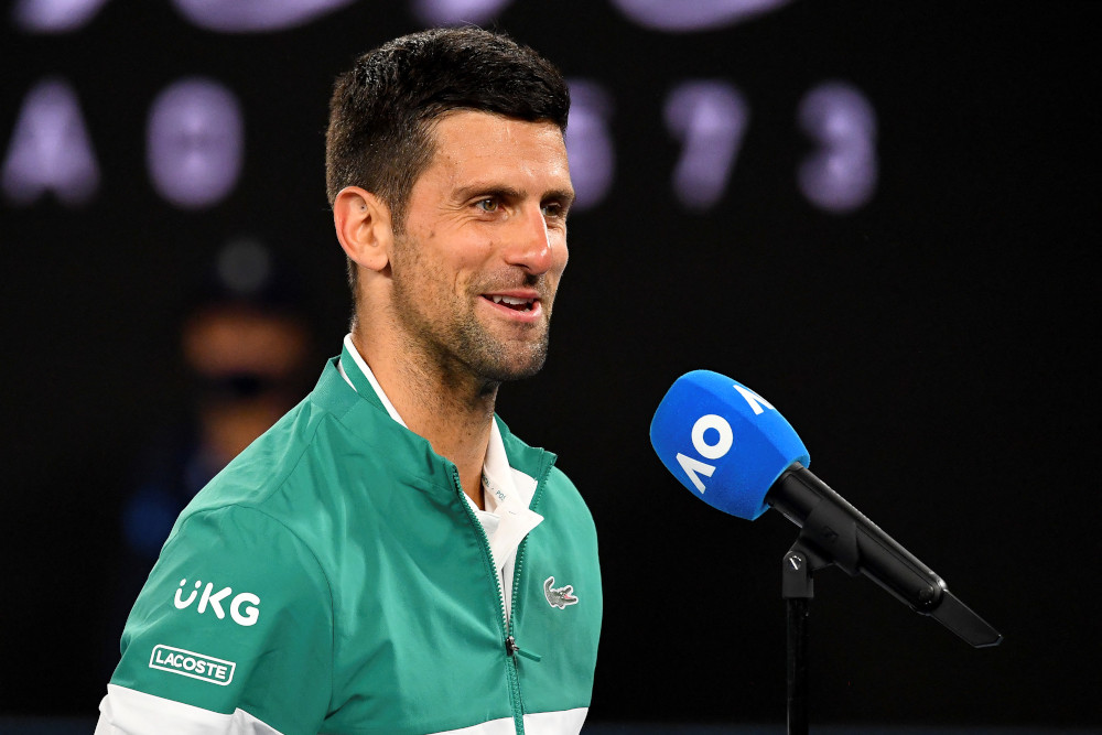 Novak Djokovic speaks after celebrations of his victory against Milos Raonic during their men’s singles match of the Australian Open tennis tournament in Melbourne February 14, 2021. — AFP pic