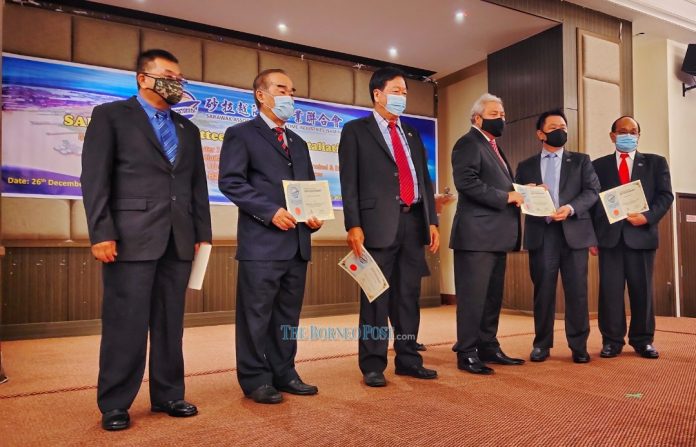 Awang Tengah (third right) presents the appointment certificate to Yong, while Ngieng (third left) and others look on during Samin’s founding and 1st committee members installation ceremony in Sibu last night.