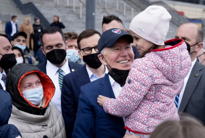 US President Joe Biden holds a girl on his arm as he and Polish Prime Minister Mateusz Morawiecki (centre) meet with Ukrainian refugees at PGE Narodowy Stadium in Warsaw on March 26, 2022. — AFP pic