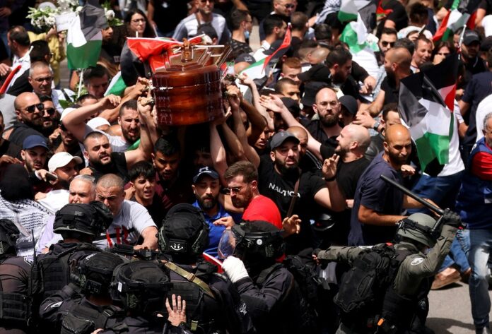 Television footage showed pallbearers struggling to stop Abu Akleh’s coffin from falling to the ground as baton-wielding Israeli police officers charged at them, grabbing Palestinian flags from mourners.