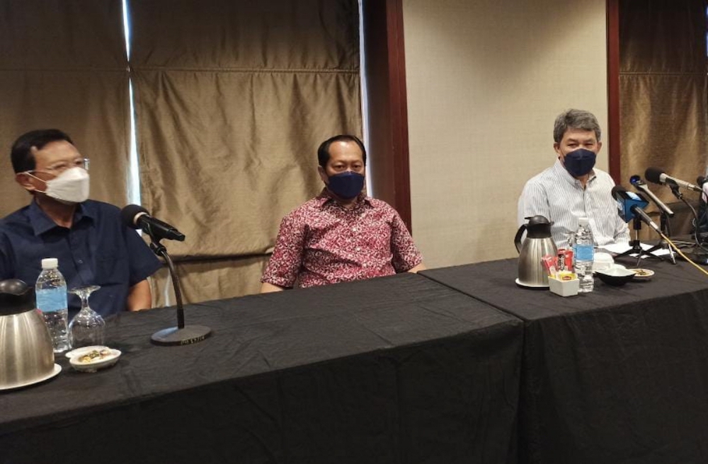 Mohamad (left) speaks to reporters at the press conference. With him are Ahmad Maslan and Ahmad Shabery. — Borneo Post pic