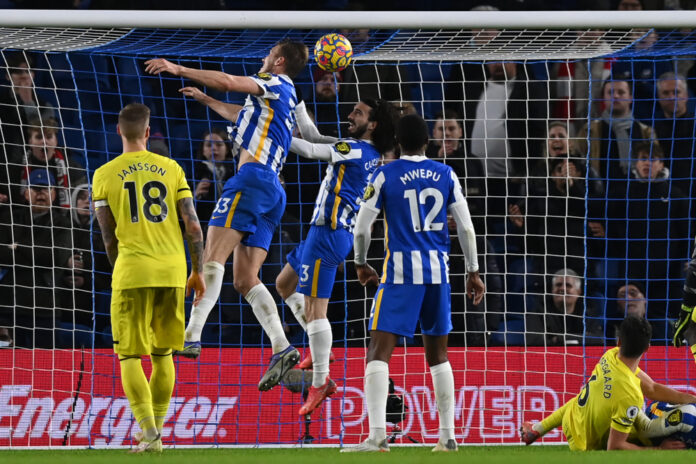 Brighton defender Marc Cucurella heads the ball off the line during the English Premier League football match against Brentford at the American Express Community Stadium in Brighton, southern England, December 26, 2021. — AFP pic