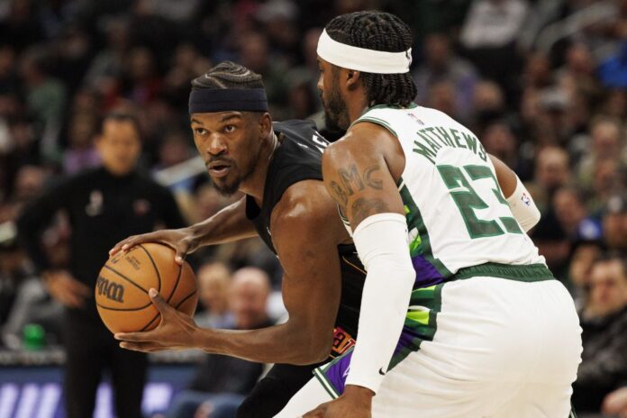 Miami Heat forward Jimmy Butler (22) holds the ball away from Milwaukee Bucks guard Wesley Matthews (23) at Fiserv Forum March 2, 2022. — Reuters pic