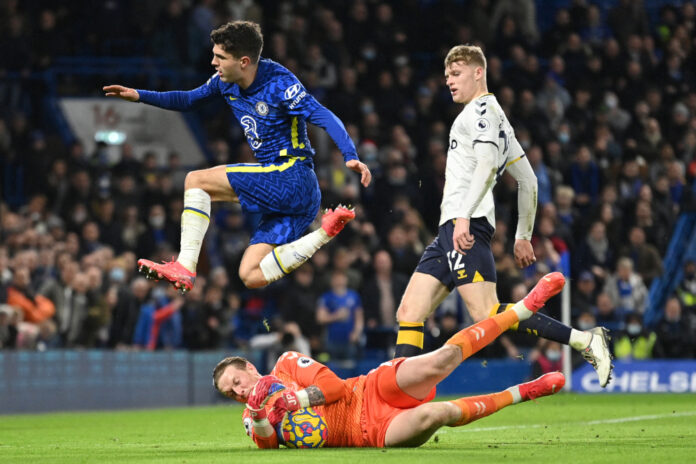 Everton goalkeeper Jordan Pickford saves at the feet of Chelsea midfielder Christian Pulisic during the English Premier League match at Stamford Bridge in London, December 16, 2021. — AFP pic