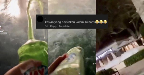 Menerusi video yang dimuat naik oleh @eliwang0000, kelihatan dia sengaja menunjukkan sebotol sabun basuh pinggan jenama Ajax berwarna hijau di kamera sebelum menuangnya ke dalam sebuah kolam air pancut.