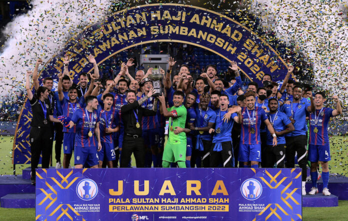 JDT players celebrate winning the Charity Shield for a record fifth time after defeating KL City FC at Iskandar Puteri February 26, 2022. — Bernama pic