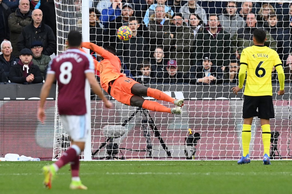 West Ham United’s defender Arthur Masuaku (unseen) scores his team’s third goal past Chelsea’s goalkeeper Edouard Mendy (centre) during the English Premier League match between West Ham United and Chelsea at The London Stadium, on December 4, 2021. — AFP pic