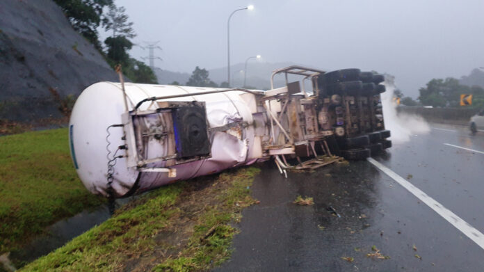 A Malaysian Highway Authority spokesman said the congestion began at 6.32pm as most of the lanes had to be closed due to the chemical spill at the accident location. — Picture from Twitter/BombaJBPM via Bernama