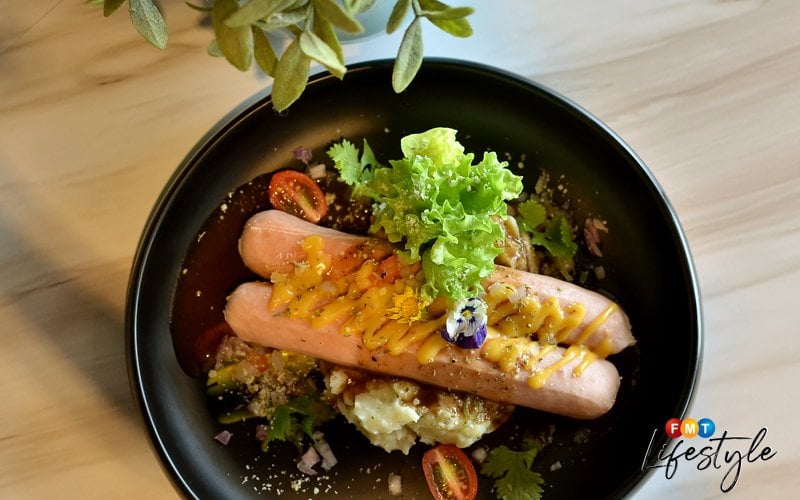 Dengan dua sosej ‘rasaksa’ dihias potongan keju serta kentang lenyek yang lembut dan enak untuk dinikmati.