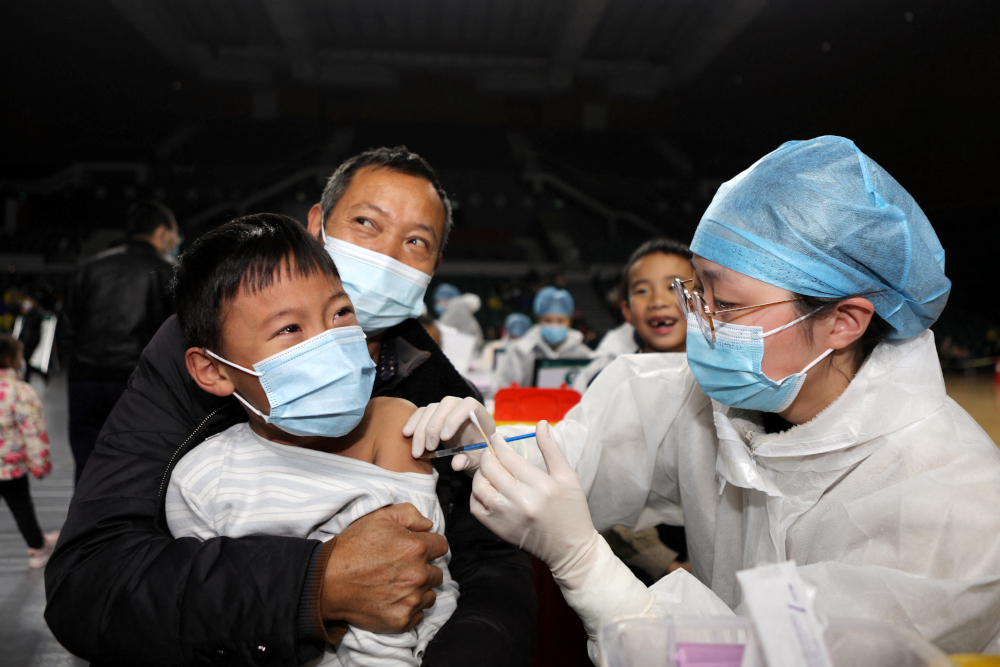 Children being vaccinated against the Covid-19 coronavirus at a basketball gymnasium in Yongchuan in Chongqing in south-west China, November 9, 2021. — AFP pic
