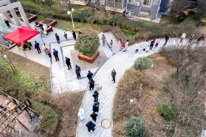 People line up during the fifth round of nucleic acid testing at a residential compound following the Covid-19 outbreak in Anyang, Henan province, China January 15, 2022. –cnsphoto via Reuters