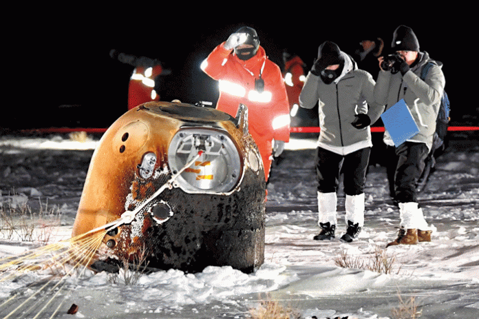 In images broadcast on state television, the blackened capsule landed on snow-covered grasslands in darkness in the country’s remote north.