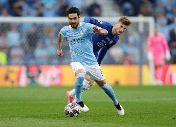 Manchester City’s Ilkay Gundogan in action with Chelsea’s Timo Werner during the Champions League final at Estadio do Dragao, Porto, Portugal, May 29, 2021. — Reuters pic