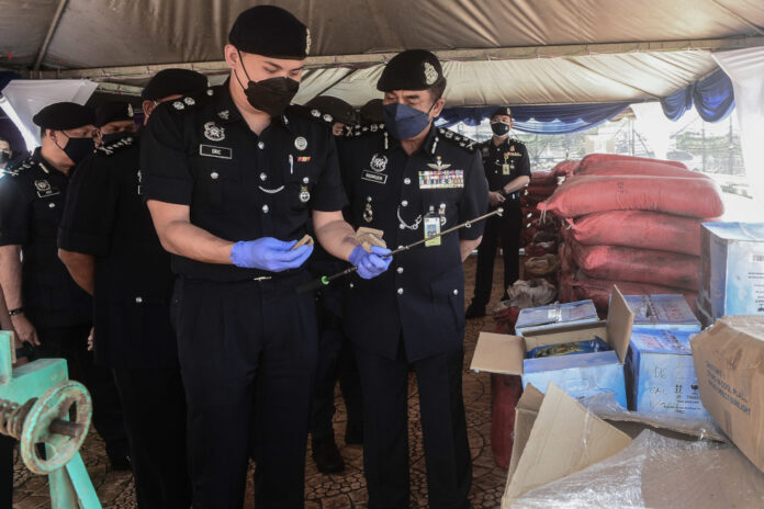 Bukit Aman Narcotics Crime Investigation Department director Datuk Razarudin Husain (2nd from right) with the seized items at the Serdang District Police Headquarters, September 20, 2021. — Bernama pic