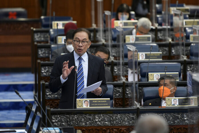 Opposition Leader Datuk Seri Anwar Ibrahim speaks at the special meeting of the fifth term of the 14th Parliament in Kuala Lumpur April 11, 2022. — Bernama pic