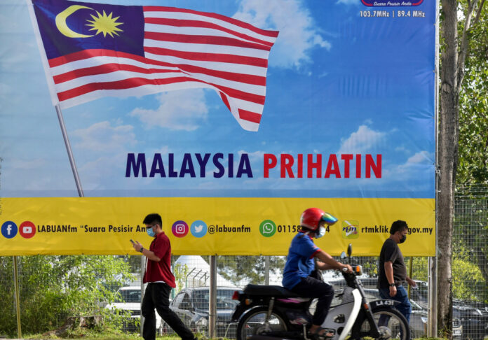 People pass by a Jalur Gemilang and Malaysia Prihatin poster in Labuan town, August 19, 2021. — Bernama pic
