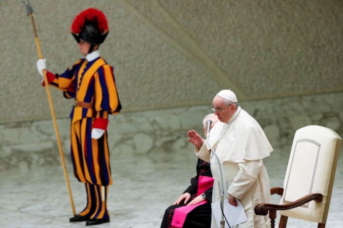 Pope Francis leads a special audience to deliver a Christmas message to Vatican workers at the Paul VI Hall at the Vatican, December 23, 2021. — Reuters pic