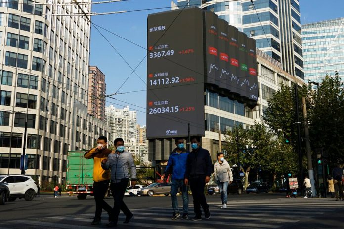 People walk by an electronic display on a building showing Chinese composite indexes in Shanghai last month. (AP pic)