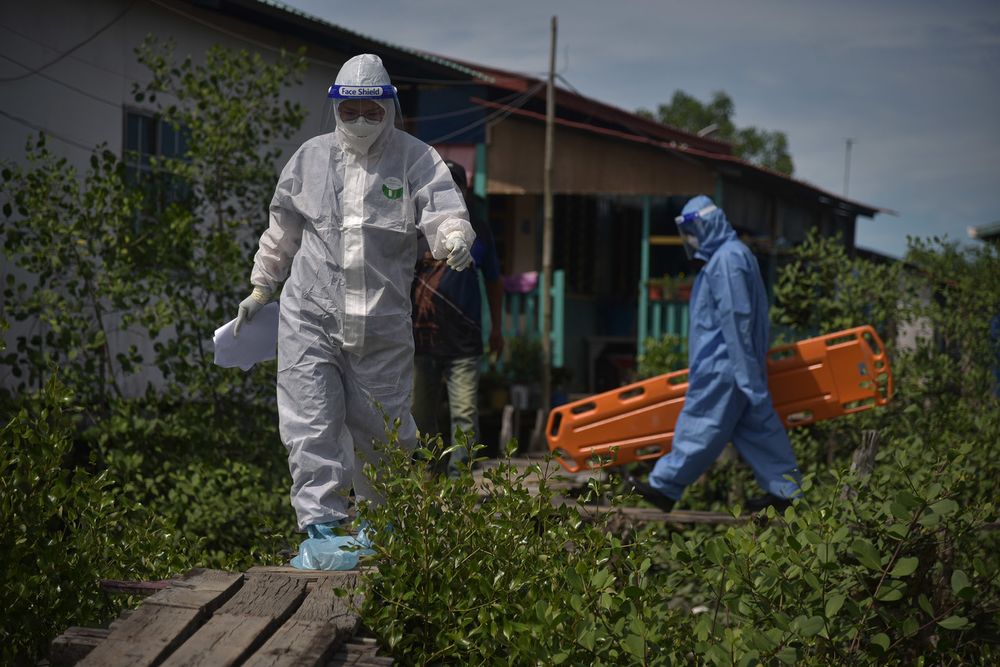 Health personnel carefully crossing a small bridge while conducting Covid-19 active case detection (ACD) at the Refugee Community Settlement Scheme in Kampung Muslim, Labuan, July 4, 2021. — Bernama pic