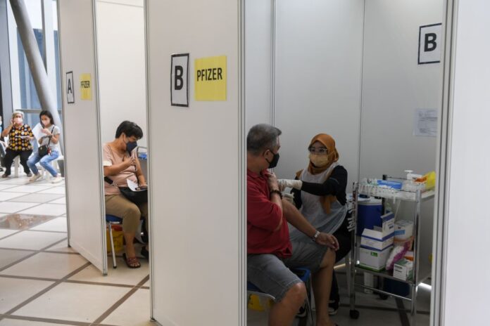 People receive their Covid-19 booster shot at the KL Gateway Mall in Kuala Lumpur January 5, 2022. — Picture by Ahmad Zamzahuri