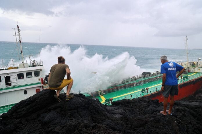 Pedestrians look at a Maurician oil tanker Tresta Star stranded on Tremblet coast in Saint-Philippe, after the passage of the tropical cyclone Batsirai as the island was placed under a cyclonic red alert, February 4, 2022. — AFP pic