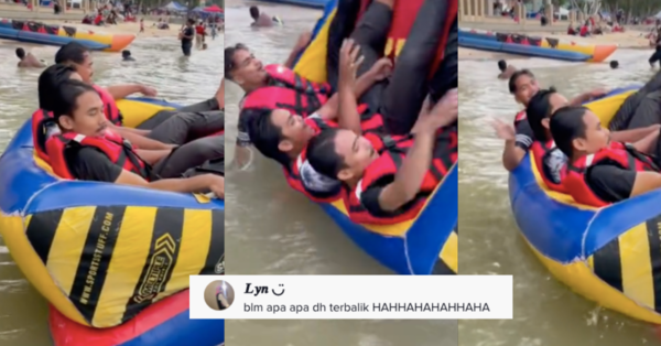 Apa yang lebih melucukan adalah apabila sedang asyik mereka rasa excited dan bersedia untuk mula. Tiba-tiba geng lelaki itu hilang kawalan dan bot itu terbalik sehingga mereka jatuh ke dalam air.
