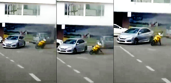 In the dashcam footage, a boy on a motorcycle, with what appears to be a child as his pillion rider, pulls a drift in order to avoid collision with a car in Bahau, Negeri Sembilan.