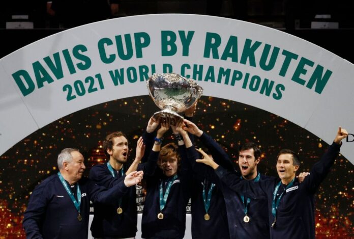 The Russian Tennis Federation team celebrates with a trophy on the podium winning the Davis Cup at the Madrid Arena December 5, 2021. — Reuters pic