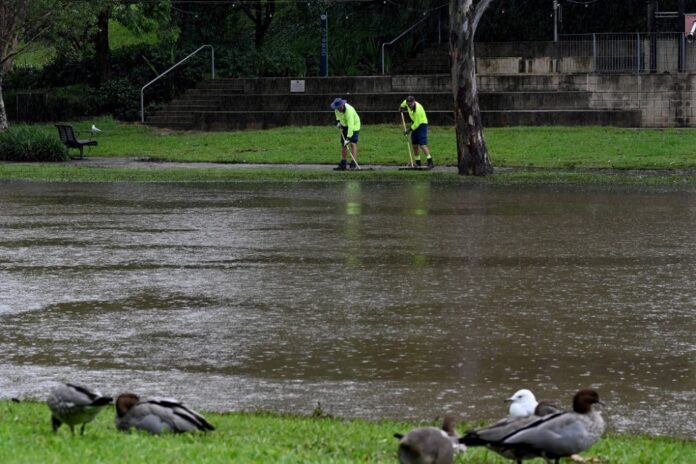 Workers clear water from the banks of the overflowing Parramatta river in Sydney February 23, 2022. — AFP pic