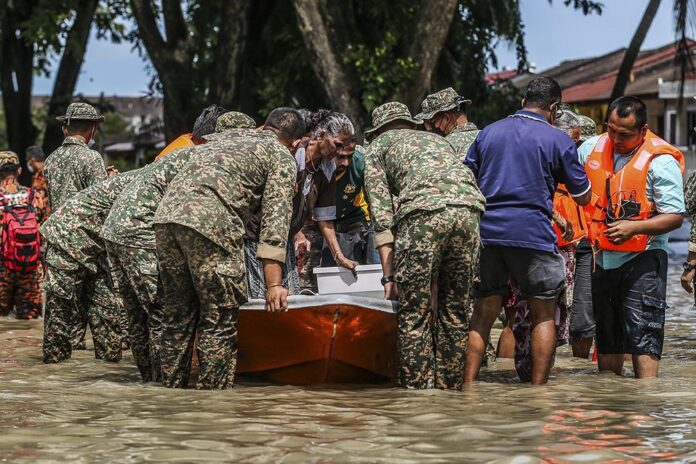 Search and rescue personnel help evacuate flood victims in Taman Sri Muda, Shah Alam December 20, 2021. — Picture by Hari Anggara