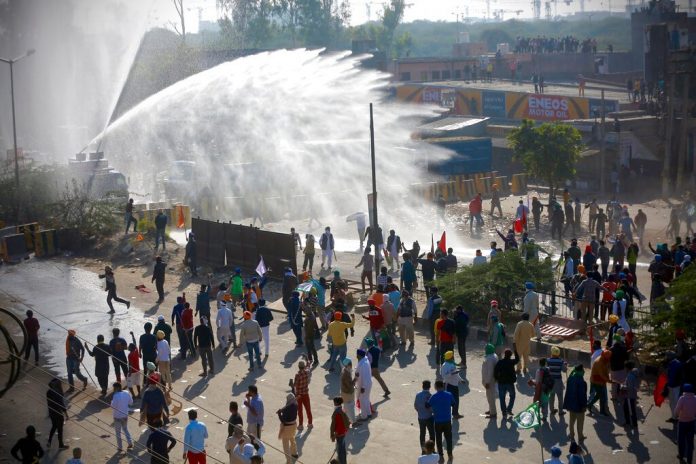 Clashes ensued, with police unleashing tear gas and water cannon to push back the farmers. Plumes of smoke rose above the fray and some protesters threw stones at police as thousands pressed against barricades, waving flags and sticks.