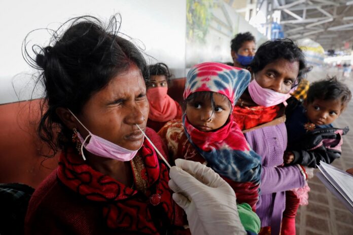 A woman reacts as a healthcare worker collects a swab sample from her to test for the coronavirus disease at a railway station in Ahmedabad, India December 29, 2021. – Reuters pic