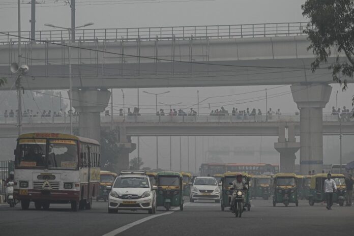 Commuters make their way along a street amid smoggy conditions in New Delhi on November 5, 2021. — AFP pic