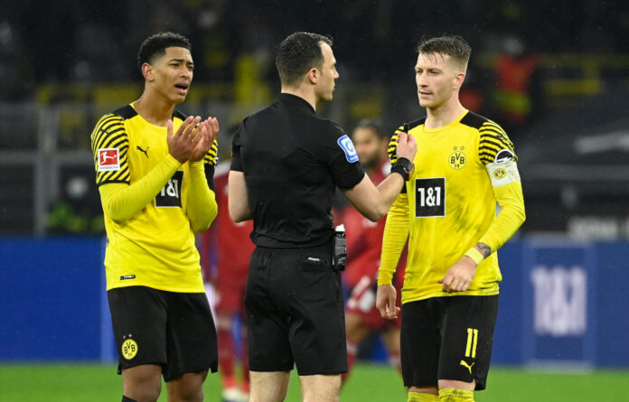 Dortmund midfielder Jude Bellingham and forward Marco Reus discuss with referee Felix Zwayer after a deliberate handball during the German first division Bundesliga football match BVB Borussia Dortmund v FC Bayern Munich in Dortmund, western Germany, December 3, 2021. — AFP pic